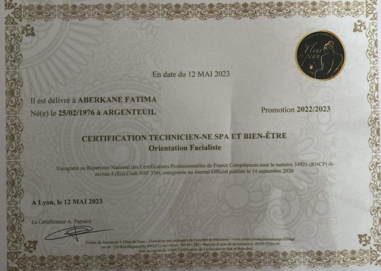 Diplômée en tant que praticienne Facialiste au sein de l’institut A Fleur de Peau à Lyon qui propose des formations de massage certifiées RNCP. Les titres RNCP sont des diplômes enregistrés au Répertoire National des Certifications Professionnelles. Ils sont recensés par la CNCP, commission nationale sous l’autorité du ministère du Travail.